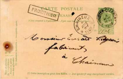 Froidthier 1908 Carte postale envoyée à Evrard LIEGEOIS par l’Abbé THYSSEN curé à Froidthier