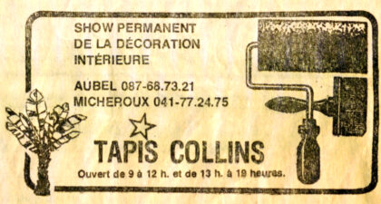Publicité extraite du « Journal d’Aubel » paru en 1982 Albert COLLINS (père) avait un commerce de droguerie à Froidthier (rue Fabriques) actuellement route d »Aubel Il a quitté Froidthier pour ouvrir un magasin à Aubel et àvoir la suite…
