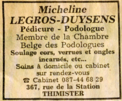 Thimister 1982 publicité podologue Micheline LEGROS-DUYSENS
