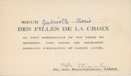 De gauche à droite: Pierre BARCHON (facteur des postes à Thimister), Marie BARCHON, Thérèse BARCHON (coiffeuse à Thimister), Jeanne BARCHON (commerce d’aunage et mercerie à Thimister), Paula BARCHON, Pauline XHAUFLAIRE.