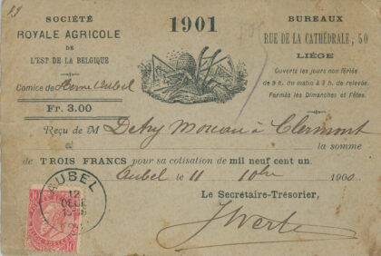 Cotisation de 3 francs payée par Moreaux DETRY de Clermont à La Société Royale Agricole de l’Est de la Belgique , section de Herve-Aubel pour l’année 1901. Le secrétaire trésorier est une personne dénommée J.WERTE