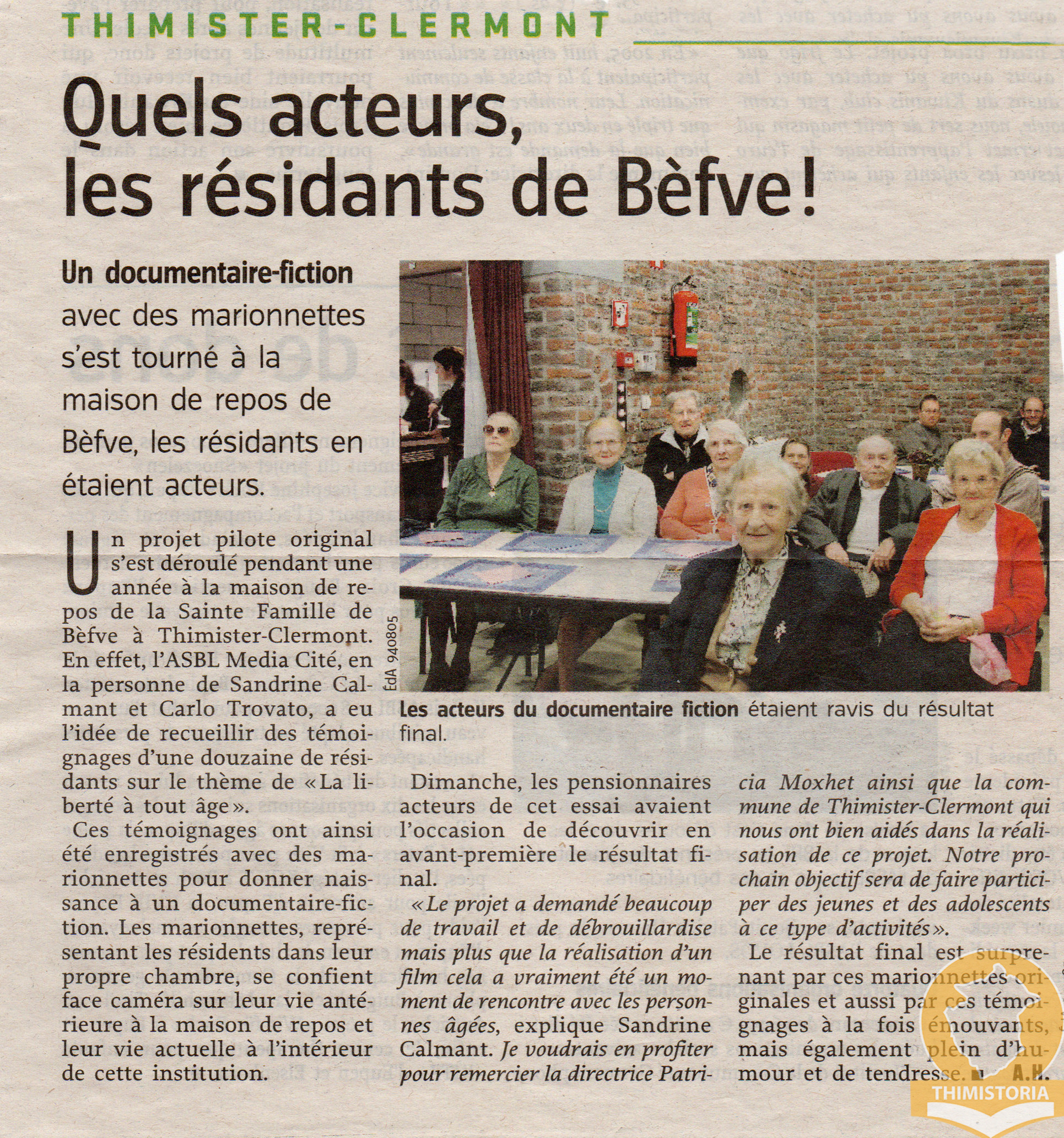 Bèfve 2007 Activité de marionnettes avec les résidents 31 janvier 202631 janvier 2026 André VERREUX Un couple d’artistes locaux ont invité les résidents de la maison de repos de Bèfve à découvrir un spectacle les mettant en scène aux travers de marionnettes. Ttous les détails dans l’article.