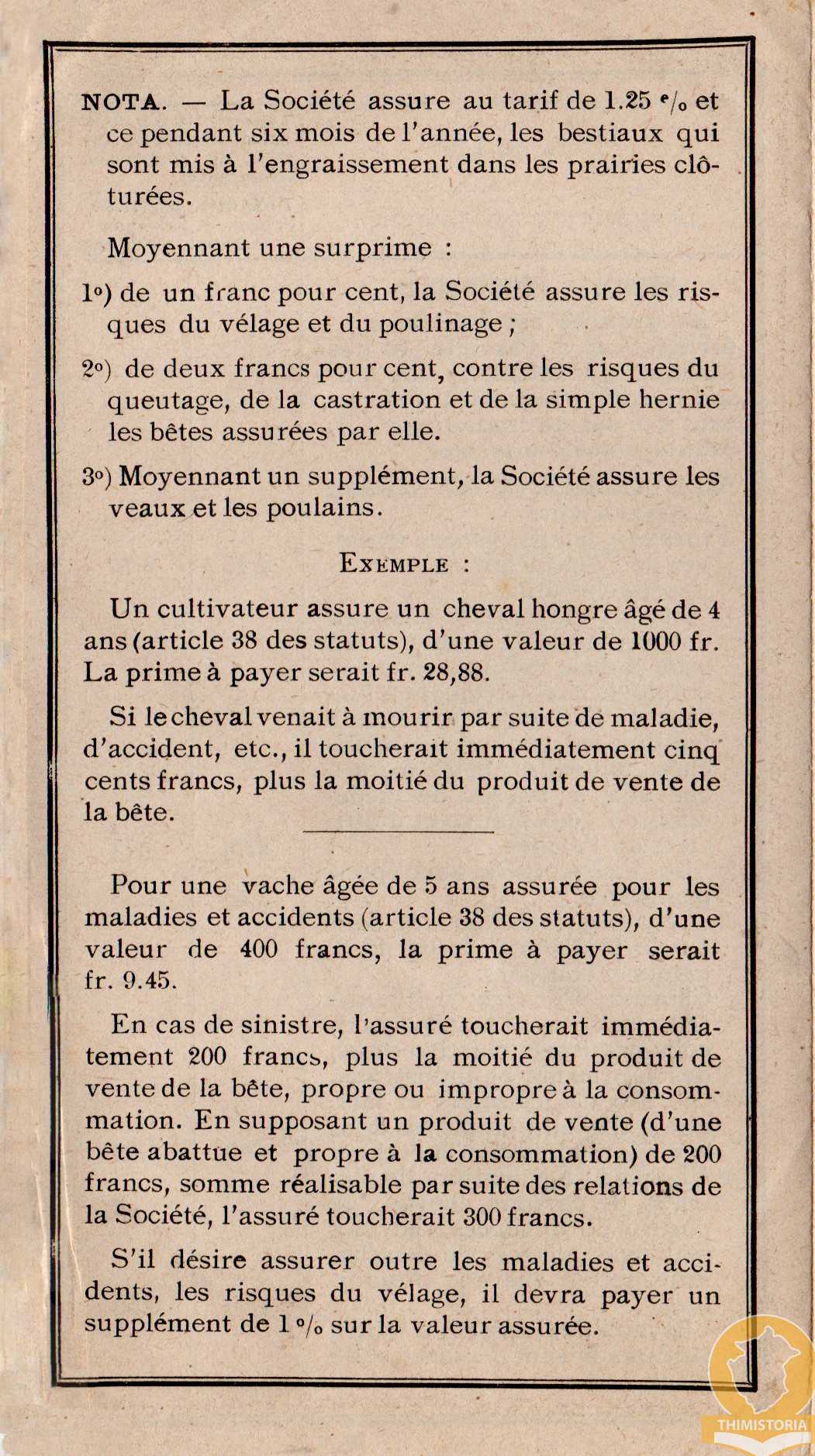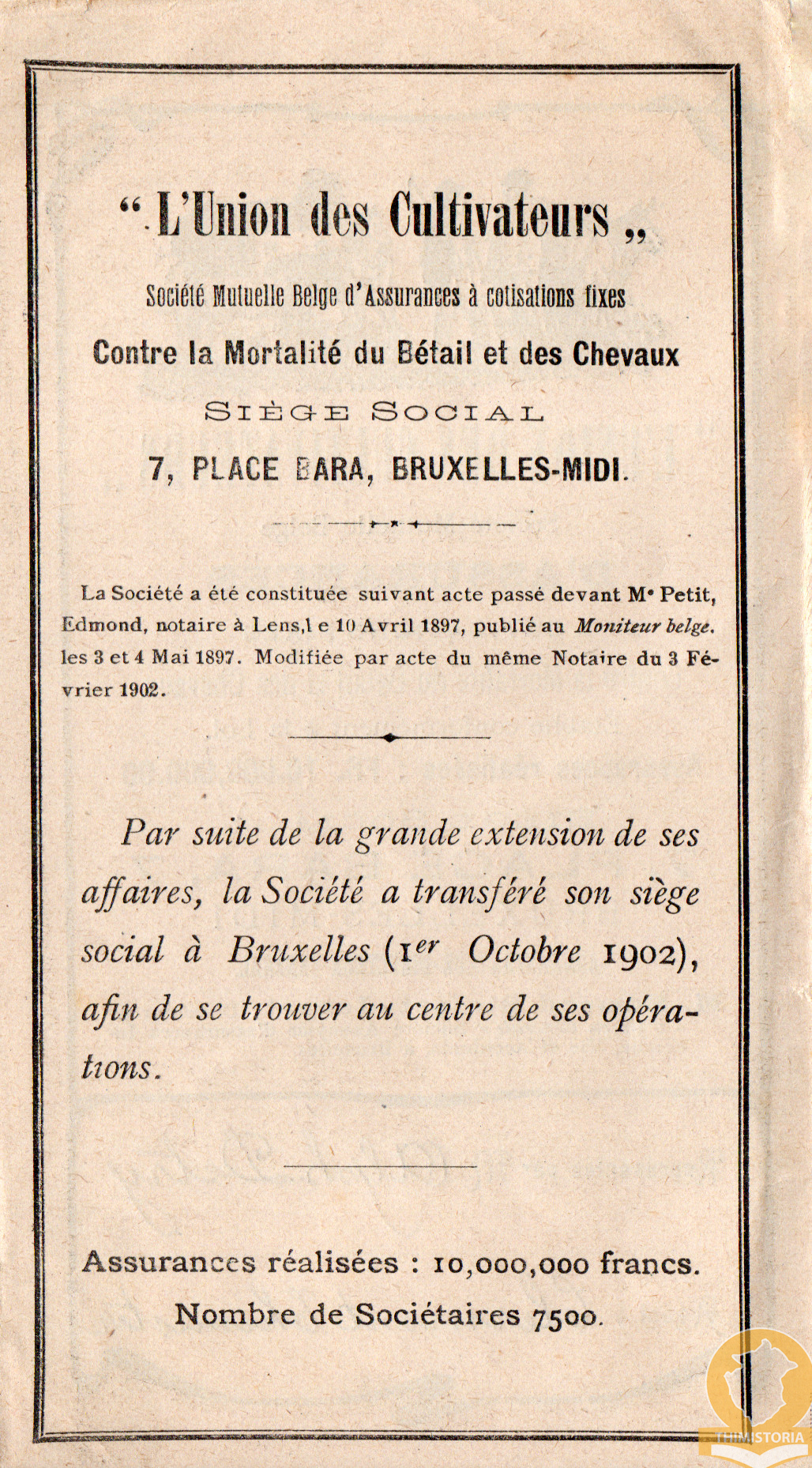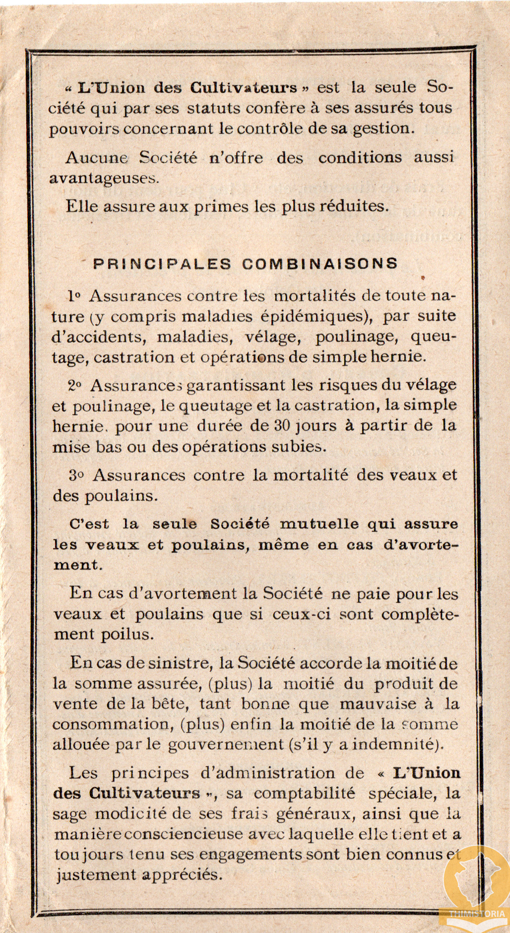 Prospectus de la compagnie d’assurance « L’Unions des Cultivateurs » contre la mortalité du bétail et des chevaux.