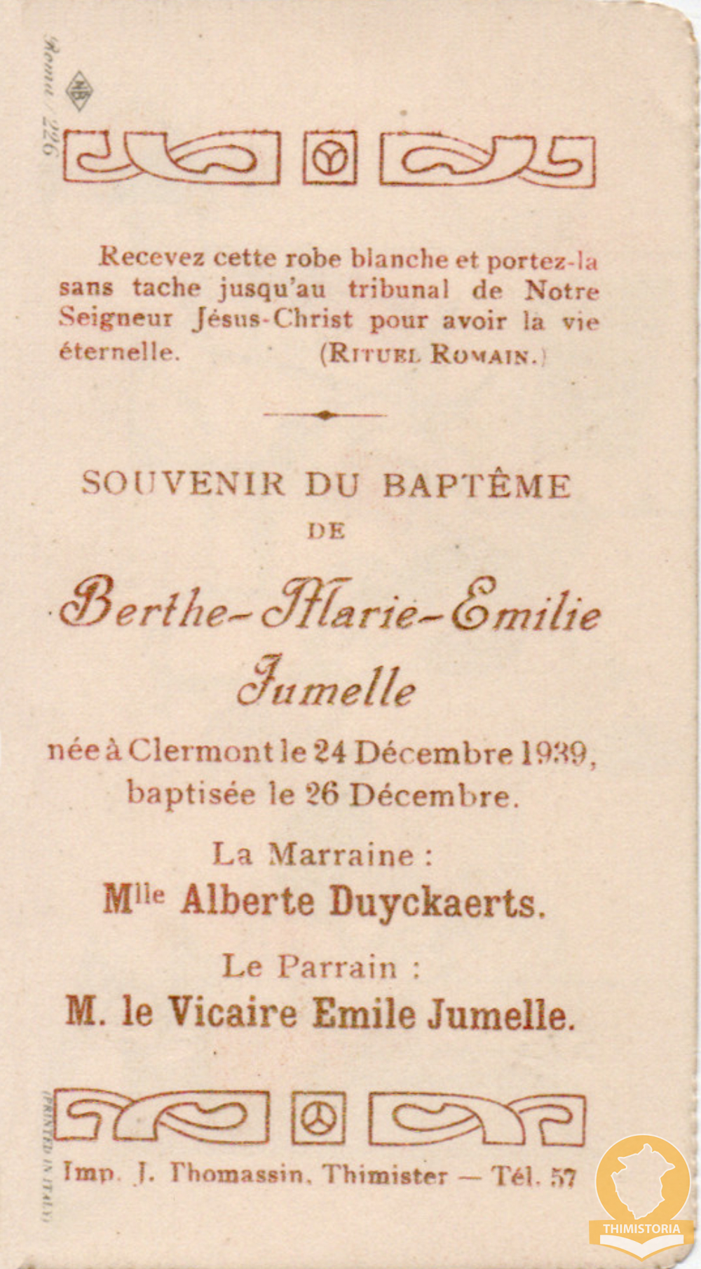 Clermont 1939 souvenir du baptême de Berthe-Marie-Émilie JUMELLE 18 octobre 202517 octobre 2025 André VERREUX