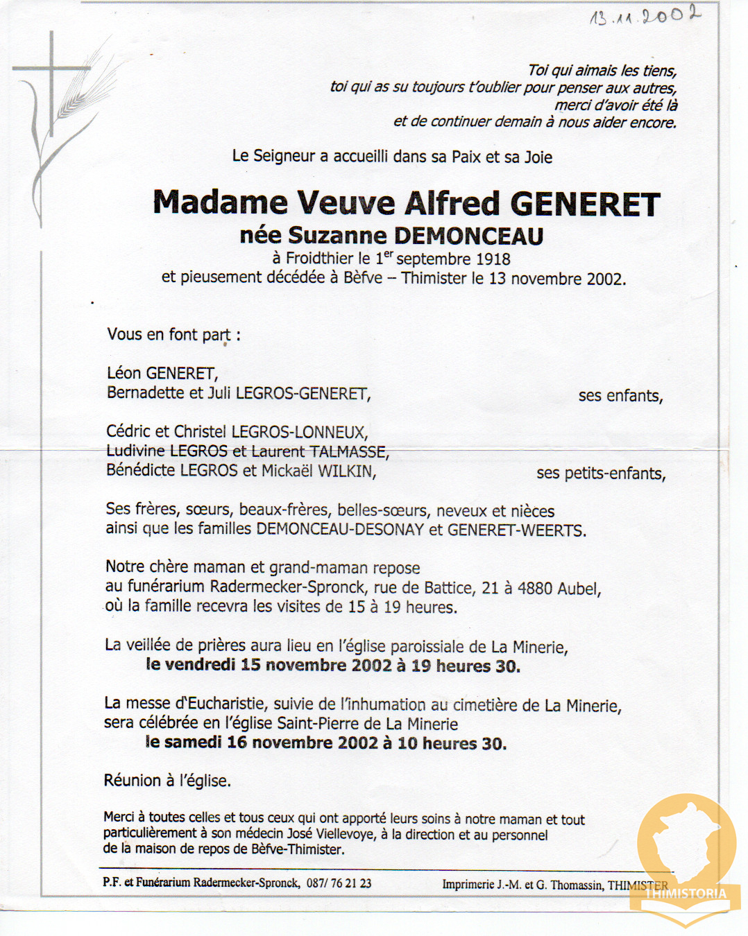 La Minerie 2002 Avis de décès de Mme Suzanne DEMONCEAU Vve d’Alfred GENERET 20 décembre 202518 décembre 2025 André VERREUX