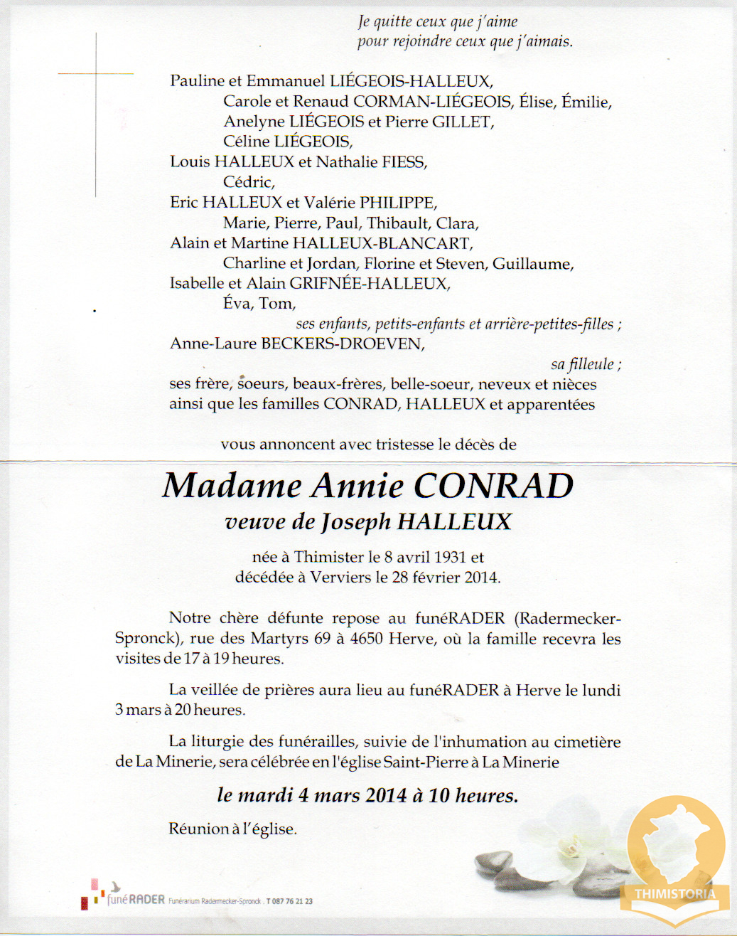 La Minerie 2014 Avis de décès de Mme Annie CONRAD Vve de Joseph HALLEUX 20 décembre 202518 décembre 2025 André VERREUX