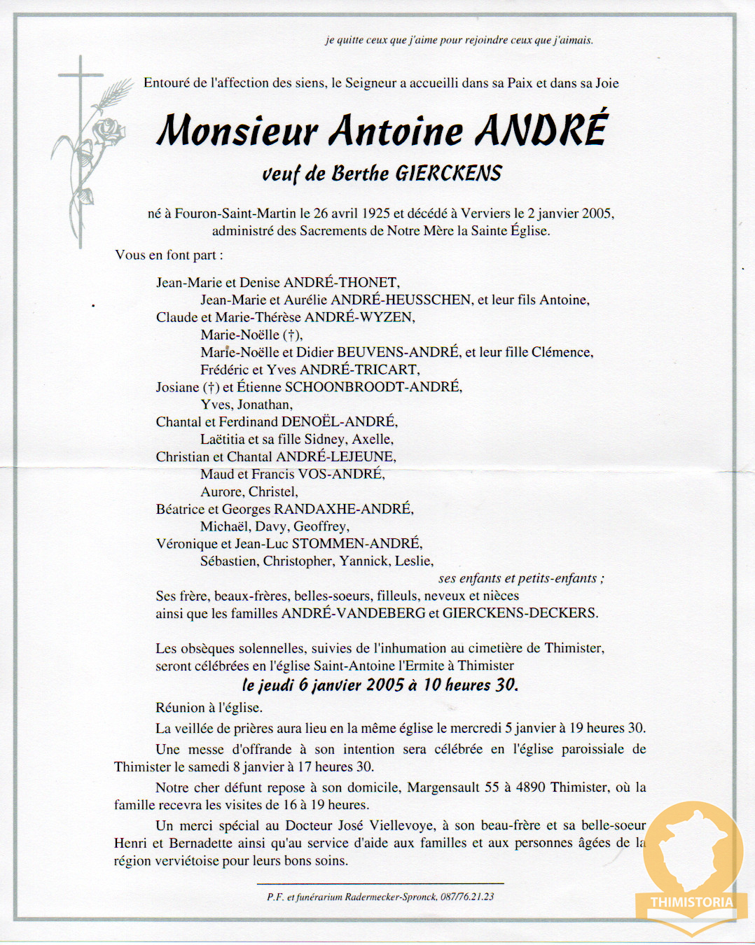 Thimister 2005 Avis de décès de M. Antoine ANDRE veuf de Berthe GIERCKENS 20 décembre 202518 décembre 2025 André VERREUX